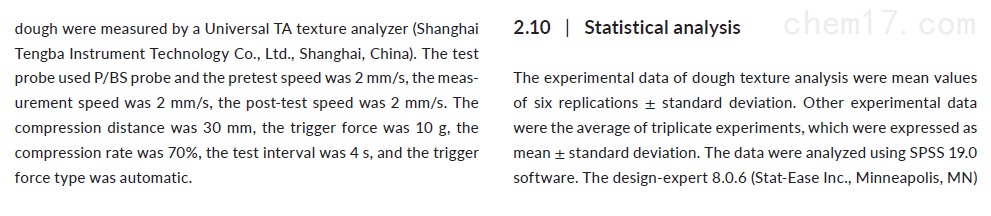 2021年,河北科技大学和石家庄学院研究人员联合在国际食品期刊《Journal of Food Processing and Preservation》(IF=2.190)发表了题为"Optimization of chestnut starch acetate synthesis by response surface methodology and its effect on dough properties“的研究论文。在该论文中,研究人员利用上海腾拔Universal TA研究型质构仪测定了面团的硬度和韧性。