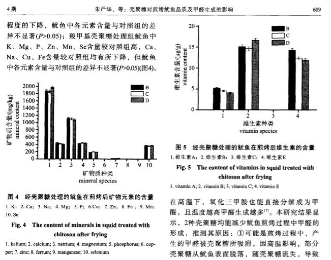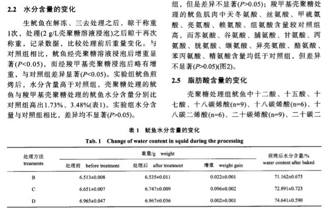 摘要 :为减少煎烤鱿鱼在制作过程中的营养损失和 甲醛的生成。实验采用2g/L的壳聚糖 溶液( 普通壳聚糖和羧甲基壳聚糖) 浸泡处理新鲜 巨型枪乌贼( 秘鲁鱿鱼) 5mi n,再进行高 温煎烤。甲醛检测的结果显示,煎烤后对照组( 纯水浸泡) 、壳聚糖组、羧甲基壳聚糖组 鱿鱼中的甲醛含量分别为45.56、4.79、8.3 0mg/kg,各组之间差异极显著。煎烤前后鱿鱼 中几种营养素的检测结果显示,壳聚糖组中天冬氨酸、丝氨酸、脯氨酸、胱氨酸、赖氨 酸、十二酸、十五酸、十七酸、十八碳烯酸( n =9 ) 、十八碳烯酸( n =6 ) 、亚油酸( n =6 ) 、二 十碳烯酸( n =9 ) 、二十碳二烯酸、二十碳 四烯酸、二十碳五烯酸( EPA) 、二十二碳五烯酸 ( n =3 ) 及元素Mg、P、Mn和维生素C含量高于对照组,其他营养素含量较对照组低。羧 甲 基壳聚糖组中天冬氨酸、丝氨酸、甲硫氨酸、亮氨酸、赖氨酸、组氨酸、十四碳烯酸、十五酸、十六碳烯酸( n =7 ) 、十七酸、花生烯酸( n=9) 、二十碳二烯酸、二十碳四烯酸、二十碳五烯 酸( EPA) 及 元素K、Mg、P、Zn、Mn、Se和 维生素B含 量高于对 照组 ,其他 营 养素含量较对照组低。另外,EPA及7种人体必需氨基酸在壳聚糖组的含量高于羧 甲基 壳聚糖组。研究表 明,2种壳聚糖均能有效抑制鱿鱼在煎烤过程中甲醛的生成,普通壳 聚糖效果更显著,并且能较好地保持鱿鱼的品质。