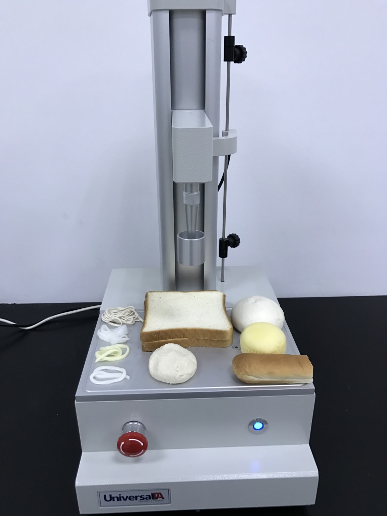 质构仪是模拟人的触觉对物理特征进行分析检测的仪器,质构仪主机的机械臂与探头衔接处有一个力学感应器,能感应探头对标本的作用力并将这种力学信号传输给电脑,在应用软件处理下,将力学信号转变为数字和图形在显示器上显现,更直接迅速记录标本的受力情况。该测试能灵敏准确地反映与力学特性有关的食品质地特性并可量化处理结果,避免人为因素对食品品质评价结果的主干扰。