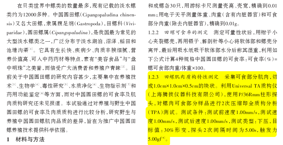 Data download2020年,广西壮族自治区水产科学研究院和广西大学动物科学技术学院研究人员在国内期刊《安徽农学通报》在线发表了题为“养殖与野生中国圆田螺可食率及肌肉质构比较分析”的研究文章。在该论文中,研究人员使用上海腾拔仪器科技有限公司的Universal TA质构仪来测定田螺肌肉的硬度、弹性、回复性、内聚性和咀嚼性指标。
