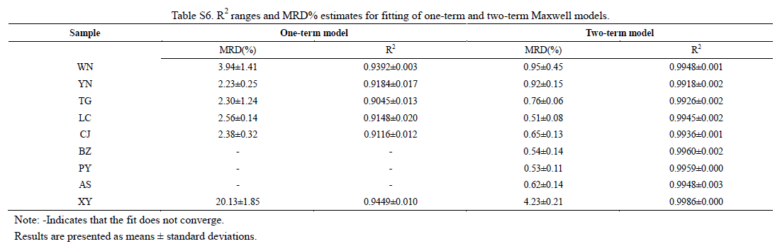 为了预测咀嚼时的waxiness,我们利用广义麦克斯韦模型(图 2)分析了山药的动态应力松弛行为,该模型常用于表征粘弹性材料的应力松弛特性。研究中采用单项和两项麦克斯韦模型来确定应力松弛行为,这两种模型均可较好地描述熟制山药的粘弹性质。数据拟合结果显示,单项模型的 R² 值范围为 0.9045 至 0.9449,平均残差偏差(MRD)为 2.23%–20.13%(表 S6)。然而,单项模型在 CJ、BZ 和 AS 样品中未能收敛。相比之下,两项麦克斯韦模型的 R² 值更高,范围为 0.9918 至 0.9986,且 MRD 值更低(0.51%–4.23%)。这些结果表明,两项麦克斯韦模型能够更准确地拟合熟制山药的应力松弛行为。