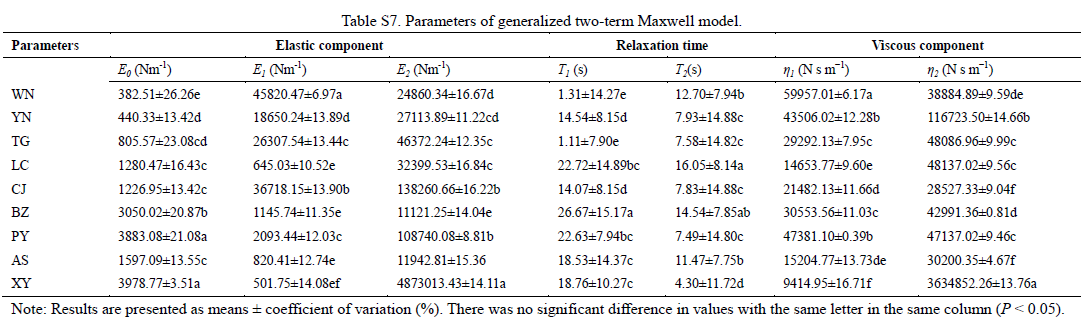 麦克斯韦模型的拟合曲线如图 2a 所示。两项麦克斯韦模型的 E0、Ei、Ti 和 η1 参数见表 S7。E0 反映了材料在持续加载时的刚度或弹性响应。在粘弹性材料中,E0 通常与材料的时间依赖性行为相关。在所有测试的山药样品中,E0 呈现梯度分布,从 WN 样品的 382.51 Nm⁻¹ 到 XY 样品的 3978.77 Nm⁻¹ 不等。XY 山药的 E0 值最高,表明其在长期应力下的变形最小,刚度更大。相比之下,WN 山药的 E0 值zui低,表明该山药品种的松弛过程更明显,柔韧性更高且质地更柔软。在麦克斯韦模型中,每个单元由代表弹性模量(Ei)的弹簧和代表黏度系数(ηi)的阻尼器组成,且这些弹簧呈串联排列。E1 和 E2 捕捉了不同时间尺度下的弹性响应,反映了材料在初始应力和长期应力下的松弛行为。值得注意的是,在waxinesszui强的 WN 样品中,E2 高于 E1,这表明即使在初始快速变形后,熟制山药仍保留了显著的弹性恢复能力。这些结果表明,WN 山药在长期应力下会发生明显的塑性变形。有趣的是,随着waxiness属性强度的降低,这一现象变得不那么明显。黏度系数 η1 和 η2 代表材料对变形的阻力,每个阻尼器捕捉黏性行为的不同方面。η1 随着waxiness属性的增强而增加,导致初始变形更慢,表明材料的黏性阻力更大。