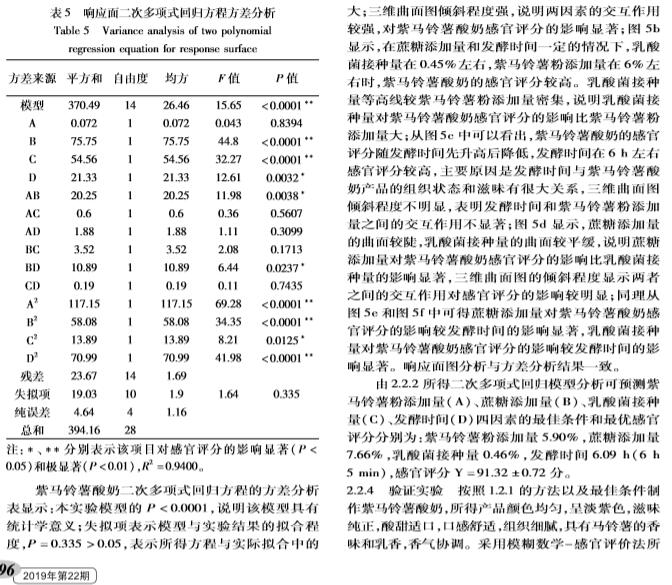 【摘要】:本实验在单因素实验的基础上,以模糊数学感官评分为指标,通过响应面实验设计对紫马铃薯酸奶的工艺及配方进行了优化,得到其*工艺配方为:乳酸菌添加量0.46%、发酵时间6.09 h、蔗糖添加量7.66%、紫马铃薯粉添加量5.90%、牛奶补足至100%。方差分析显示各因素对紫马铃薯酸奶感官评分的影响:蔗糖添加量乳酸菌添加量发酵时间紫马铃薯粉添加量。通过对紫马铃薯酸奶的质构指标进行主成分分析分析,提取出两个主成分,构建出了紫马铃薯酸奶的综合质构品质评价模型,应用此模型对紫马铃薯酸奶的品质进行评判具有可行性。