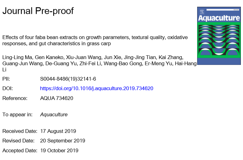 Technical articles2019年10月16日,水产领域期刊《Aquaculture》(IF=3.022)在线发表了中国水产科学研究院珠江水产研究所研究团队题为“Effects of four faba bean extracts on growth parameters, textural quality, oxidative responses, and gut characteristics in grass carp”的研究论文。