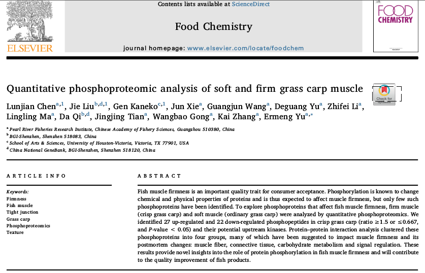 2019年8月16日,食品期刊《Food Chemistry》(一区,IF=5.399)在线发表了中国水产科学研究院珠江水产研究所研究团队题为“Quantitative phosphoproteomic analysis of soft and firm grass carp muscle”的研究论文。