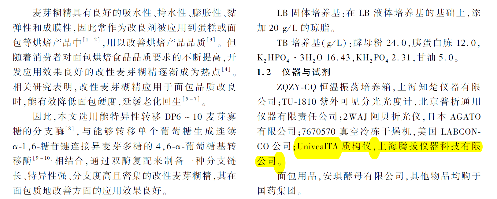 Technical articles2021年,江南大学食品科学与技术国家重点实验室研究人员在国内期刊《食品与发酵工业》发表了题为“改性麦芽糊精的酶法制备及其在烘焙制品中的应用"的研究论文。在该论文中,研究人员用上海腾拔Universal TA质构仪测定面包的硬度。