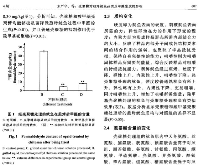 摘要 :为减少煎烤鱿鱼在制作过程中的营养损失和 甲醛的生成。实验采用2g/L的壳聚糖 溶液( 普通壳聚糖和羧甲基壳聚糖) 浸泡处理新鲜 巨型枪乌贼( 秘鲁鱿鱼) 5mi n,再进行高 温煎烤。甲醛检测的结果显示,煎烤后对照组( 纯水浸泡) 、壳聚糖组、羧甲基壳聚糖组 鱿鱼中的甲醛含量分别为45.56、4.79、8.3 0mg/kg,各组之间差异极显著。煎烤前后鱿鱼 中几种营养素的检测结果显示,壳聚糖组中天冬氨酸、丝氨酸、脯氨酸、胱氨酸、赖氨 酸、十二酸、十五酸、十七酸、十八碳烯酸( n =9 ) 、十八碳烯酸( n =6 ) 、亚油酸( n =6 ) 、二 十碳烯酸( n =9 ) 、二十碳二烯酸、二十碳 四烯酸、二十碳五烯酸( EPA) 、二十二碳五烯酸 ( n =3 ) 及元素Mg、P、Mn和维生素C含量高于对照组,其他营养素含量较对照组低。羧 甲 基壳聚糖组中天冬氨酸、丝氨酸、甲硫氨酸、亮氨酸、赖氨酸、组氨酸、十四碳烯酸、十五酸、十六碳烯酸( n =7 ) 、十七酸、花生烯酸( n=9) 、二十碳二烯酸、二十碳四烯酸、二十碳五烯 酸( EPA) 及 元素K、Mg、P、Zn、Mn、Se和 维生素B含 量高于对 照组 ,其他 营 养素含量较对照组低。另外,EPA及7种人体必需氨基酸在壳聚糖组的含量高于羧 甲基 壳聚糖组。研究表 明,2种壳聚糖均能有效抑制鱿鱼在煎烤过程中甲醛的生成,普通壳 聚糖效果更显著,并且能较好地保持鱿鱼的品质。
