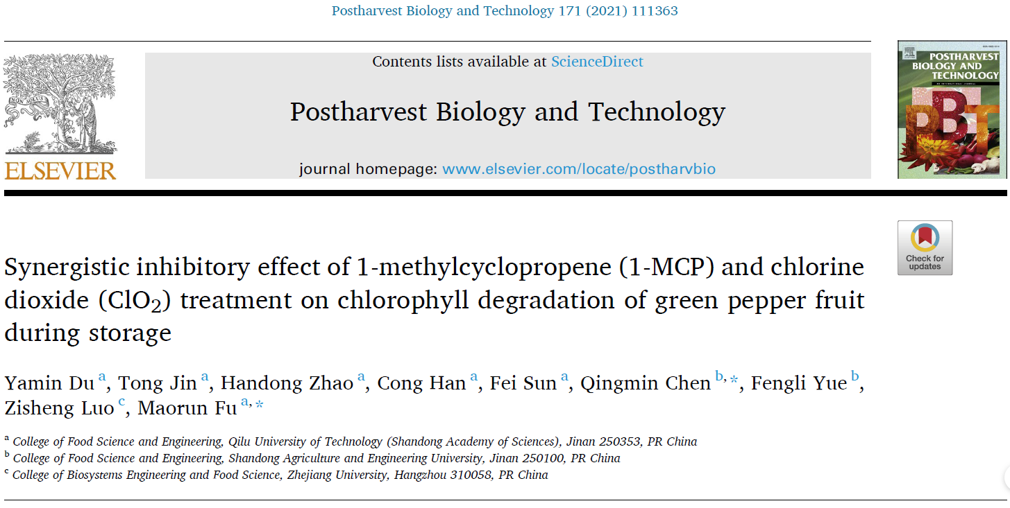 近期,齐鲁工业大学食品科学与工程学院和山东农业工程学院食品科学与工程学院研究人员在中科院一区期刊《Postharvest Biology and Technology》(IF=4.303)在线发表了题为“Synergistic inhibitory effect of 1-methylcyclopropene (1-MCP) and chlorine dioxide (ClO2) treatment on chlorophyll degradation of green pepper fruit during storage”的研究文章。