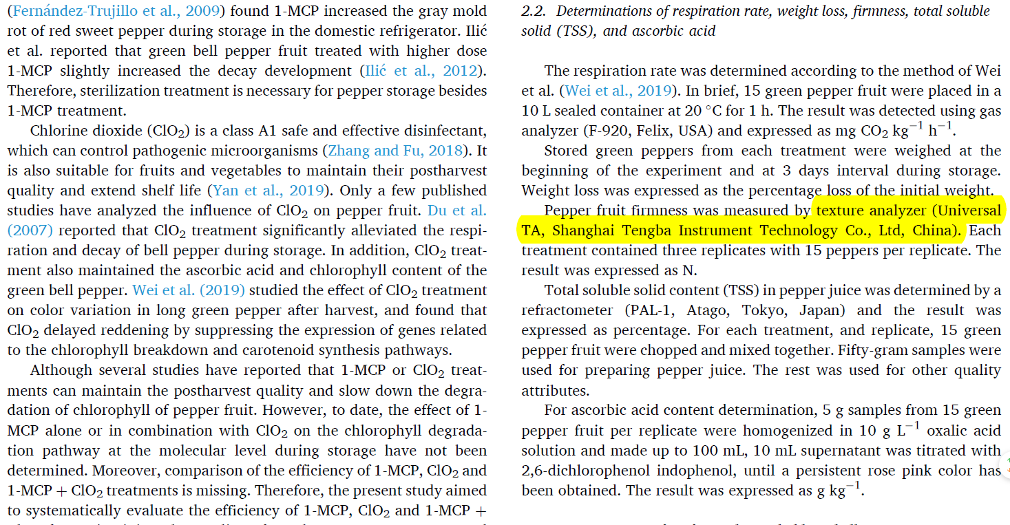 在该文章中,研究人员使用上海腾拔仪器Universal TA研究型质构仪来测定青椒的硬度。