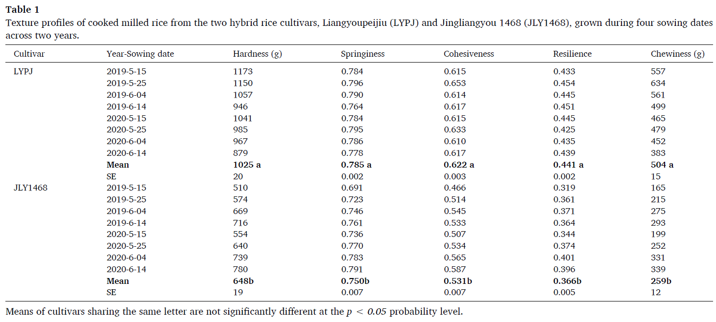 在该论文中,研究人员进行野外试验来对比两个杂交水稻品种--个是最近发布的高品质品种(Jingliangyou 1468, JLY1468)和一个相对更老的品种(Liangyoupeijiu, LYPJ)。质构仪测试结果表明JLY1468中熟精米的硬度、弹性、内聚性、回复性和咀嚼性都低于LYPJ,这是由于JLY1468精米粉更低的直连淀粉含量和改变的糊化特性的影响。相比LYPJ,JLY1468活性消化持续时间缩短26%,来自淀粉消化的葡萄糖产生率快33%。该研究强调我们应该关注与培育具有软质地的高品质杂交水稻品种相关的潜在健康风险。