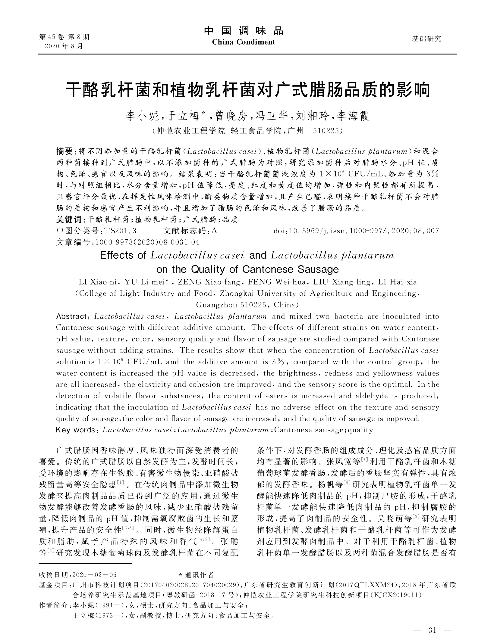 质构仪相关论文:干酪乳杆菌和植物乳杆菌对广式腊肠品质的影响