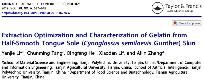 2019年6月24日,食品期刊《Journal of Aquatic Food Product Technology》在线发表了天津工业大学材料科学与工程学院研究团队题为“Extraction Optimization and Characterization of Gelatin from Half-Smooth Tongue Sole (Cynoglossus semilaevis Gunther) Skin”的研究论文。