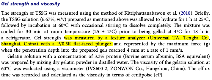 在该研究论文中,研究人员利用上海腾拔的Universal TA研究型质构仪用于测定鱼皮明胶的凝胶强度。