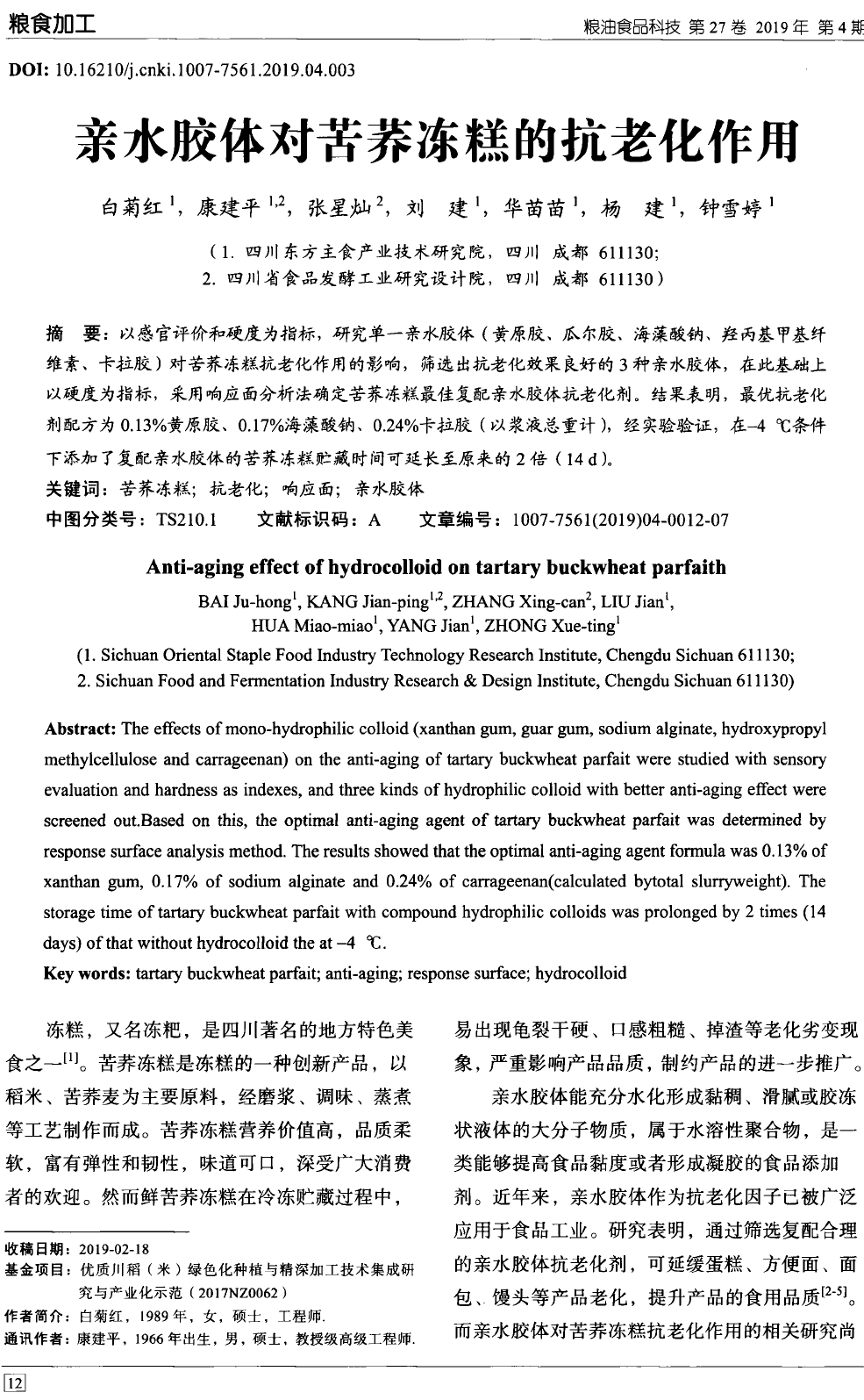 摘要:以感官评价和硬度为指标,研究单一亲水胶体(黄原胶、瓜尔胶、海藻酸钠、羟丙基甲基纤维素、卡拉胶)对苦荞冻糕抗老化作用的影响,筛选出抗老化效果良好的3种亲水胶体,在此基础上以硬度为指标,采用响应面分析法确定苦荞冻糕复配亲水胶体抗老化剂。结果表明,抗老化剂配方为0.13%黄原胶、0.17%海藻酸钠、0.24%卡拉胶(以浆液总重计),经实验验证,在-4℃条件下添加了复配亲水胶体的苦荞冻糕贮藏时间可延长至原来的2倍(14 d)。