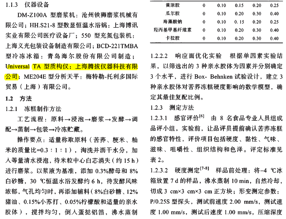 Data download2019年,四川东方主食产业技术研究院研究人员在国内期刊《粮油食品科技》在线发表了题为“亲水胶体对苦荞冻糕的抗老化作用”的研究文章。在该论文中,研究人员使用上海腾拔仪器科技有限公司的Universal TA质构仪来测定苦荞冻糕的硬度。